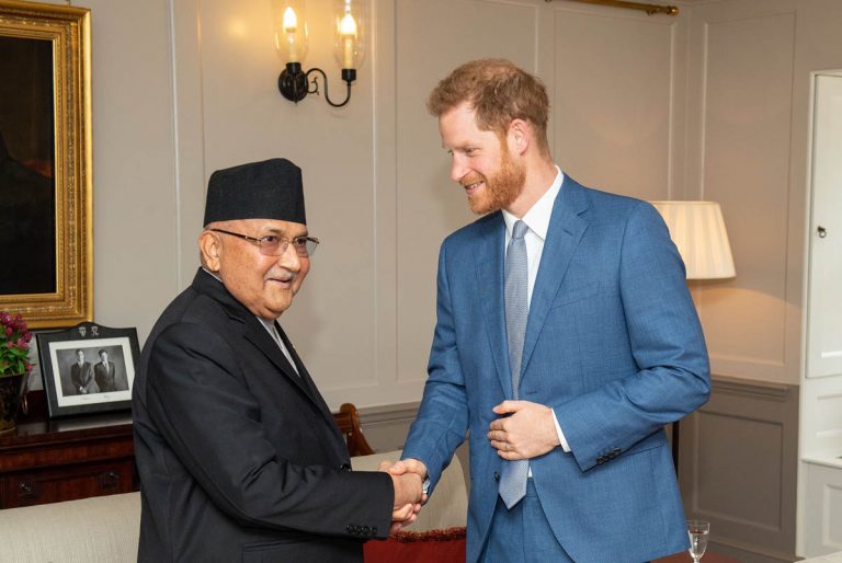 Nepal Foreign Affairs (11 June 2019) – Prince Harry met with KP Sharma Oli, Prime Minister of Nepal, and his wife Radhika Shakya today at Kensington Palace.